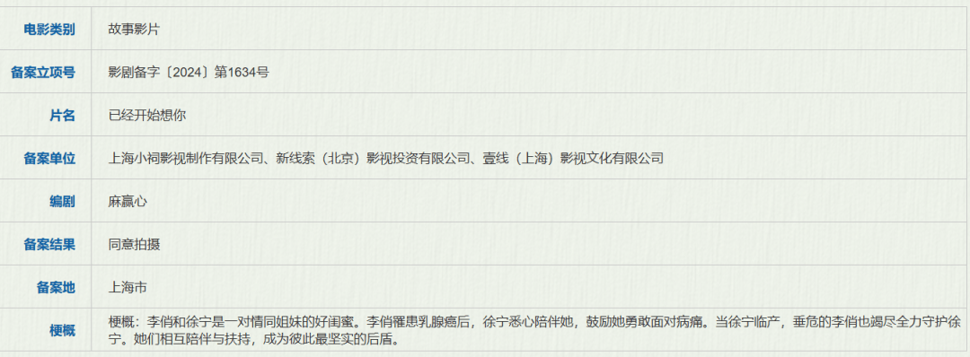 《鹦鹉杀》导演麻赢心带来新作《已经开始想你》,从梗概来看是双女主题材,近些年“双女主”模式随着《我的天才女友》的流行而愈发受到欢迎,《你好,李焕英》《热辣滚烫》的卖座也说明了爱情之外的女性情感成长类影片的市场潜力,包括《鹦鹉杀》主演周冬雨过去参演的《七月与安生》也一度引起广泛讨论。麻赢心擅长细致描绘女性情感与心理,在这次的双女主题材影片中应该也会有不错的发挥。