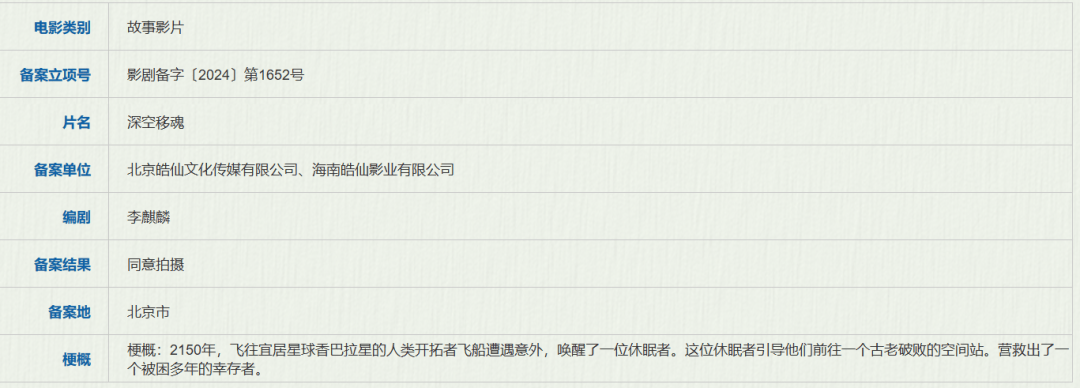 皓仙文化致力于打造各种小成本科幻网络电影,包括《变体》《天逆骑士·变体》等,今年又继续推出了同类型影片《深空移魂》——本片编剧李麒麟导演过国产科幻恐怖片《星际变种》,于2023年11月上映。目前,科幻惊悚对于国产电影来说还处在起步摸索阶段,尽管受众范围和制作成本都十分有限,但也只有不断尝试才可能获得更多的经验和成绩。