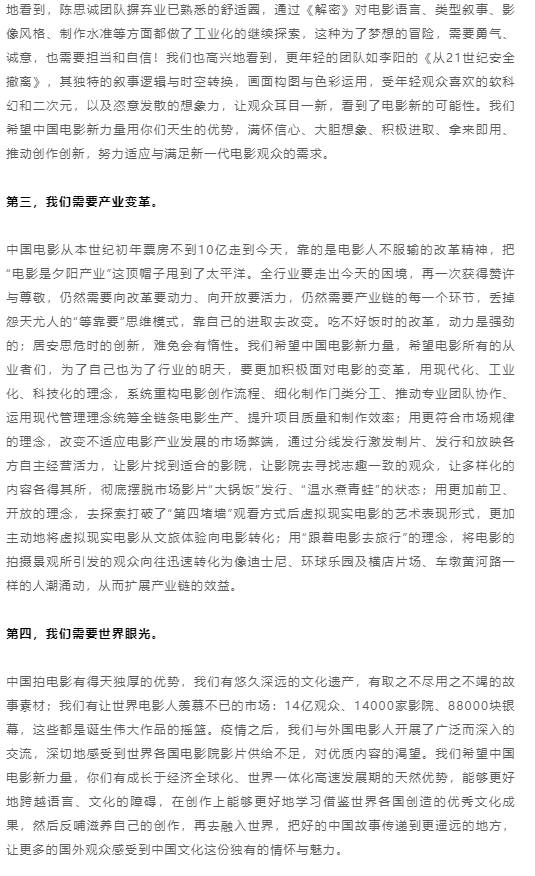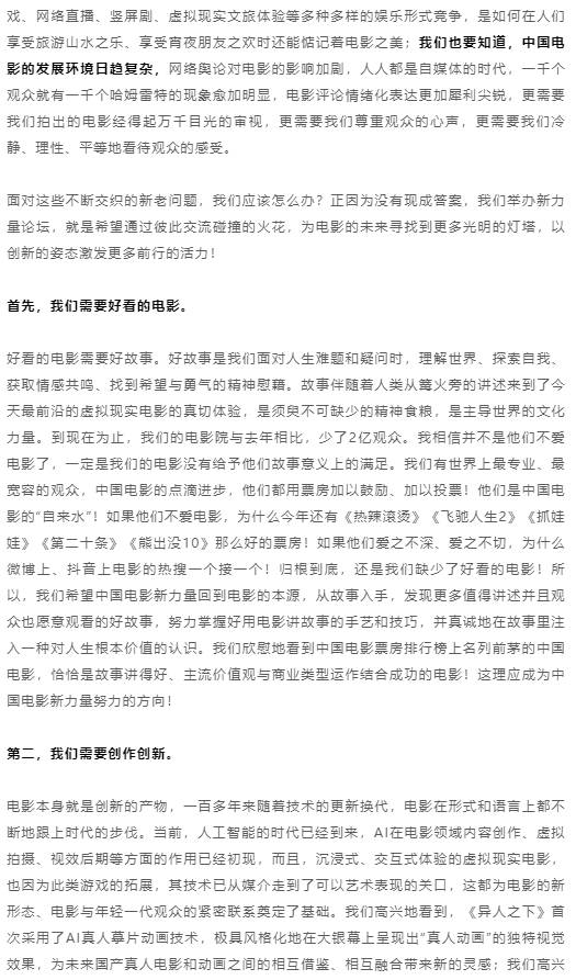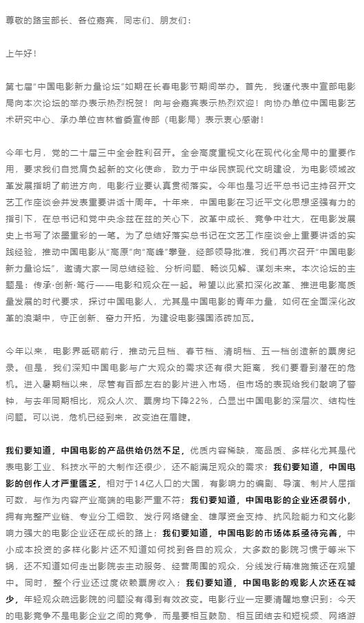搜狐娱乐讯 8月29日,电影局常务副局长毛羽现身第七届中国电影新力量论坛,并发表致辞,毛羽在致辞中谈论中国电影市场现状:我们要知道,中国电影的产品供给仍然不足,优质内容稀缺,高品质、多样化尤其是代表电影工业、科技水平的大制作还很少,还不能满足观众的需求;我们要知道,中国电影的创作人才严重匮乏,相对于14亿人口的大国,有影响力的编剧、导演、制片人屈指可数,与作为内容产业高端的电影严重不符;我们要知道,中国电影的企业还很弱小,拥有完整产业链、专业分工细致、发行网络健全、雄厚资金支持、抗风险能力和文化影响力强大的电影企业还在成长的路上;我们要知道,中国电影的市场体系亟待完善,中小成本投资的多样化影片还不知道如何找到各自的观众,大多数的影院习惯于等米下锅,还不知道如何走出影院去主动服务、经营周围的观众,分线发行精准施策还在观望中。同时,整个行业还过度依赖票房收入;我们要知道,中国电影的观影人次还在减少,年轻观众疏远影院的问题没有得到有效改变。电影行业一定要清醒地意识到:今天的电影竞争不是电影企业之间的竞争,而是要相互鼓励、相互团结去和短视频、网络游戏、网络直播、竖屏剧、虚拟现实文旅体验等多种多样的娱乐形式竞争,是如何在人们享受旅游山水之乐、享受宵夜朋友之欢时还能惦记着电影之美;我们也要知道,中国电影的发展环境日趋复杂,网络舆论对电影的影响加剧,人人都是自媒体的时代,一千个观众就有一千个哈姆雷特的现象愈加明显,电影评论情绪化表达更加犀利尖锐,更需要我们拍出的电影经得起万千目光的审视,更需要我们尊重观众的心声,更需要我们冷静、理性、平等地看待观众的感受。