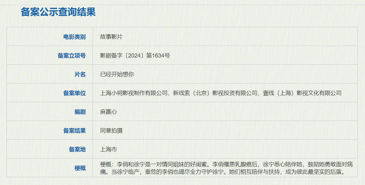 搜狐娱乐讯 据国家电影局最新立项公示,《鹦鹉杀》导演麻赢心编剧的新片《已经开始想你》立项。