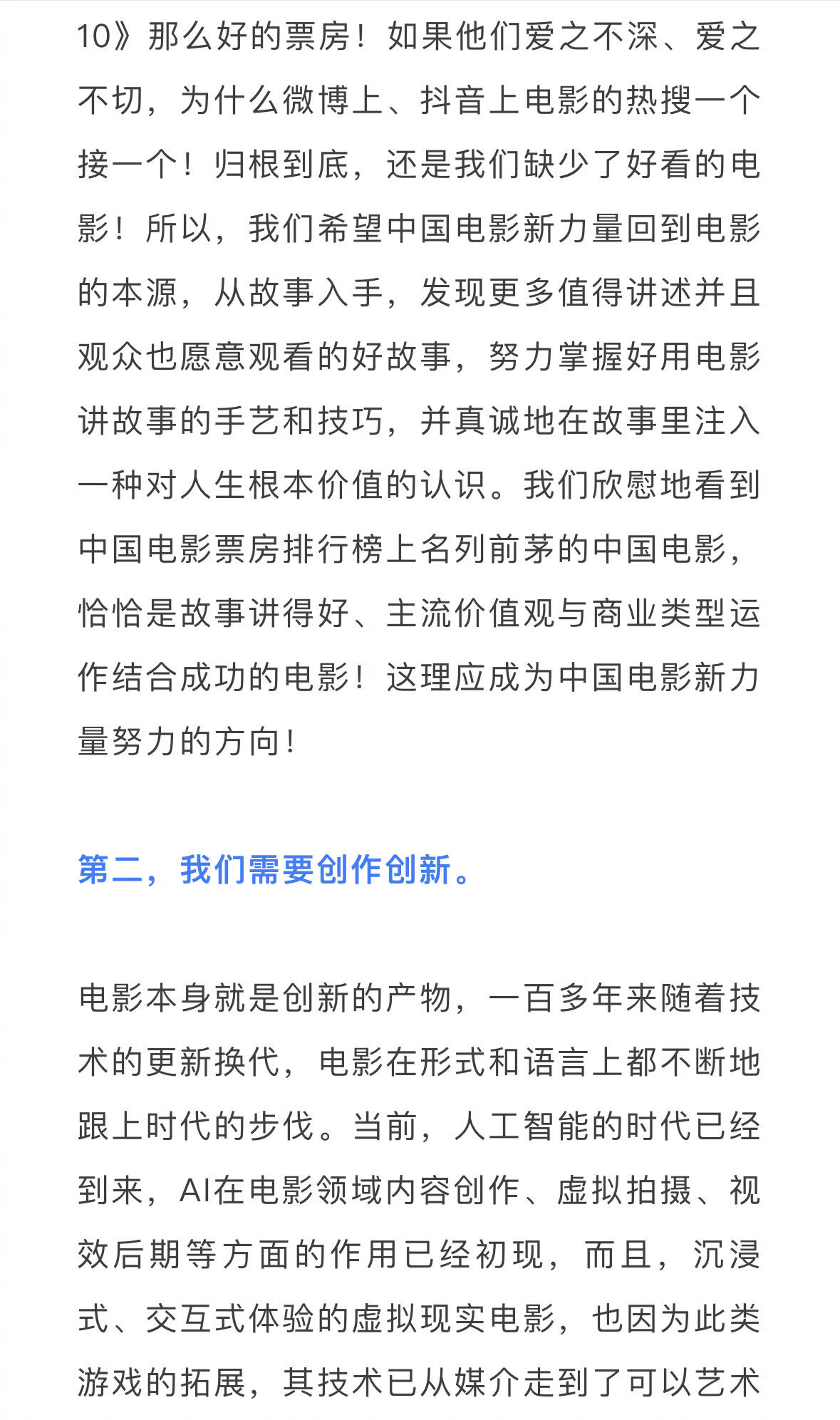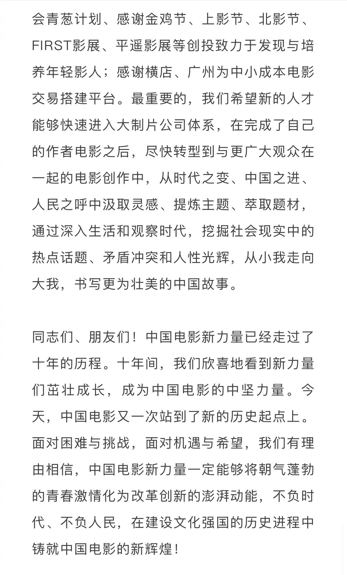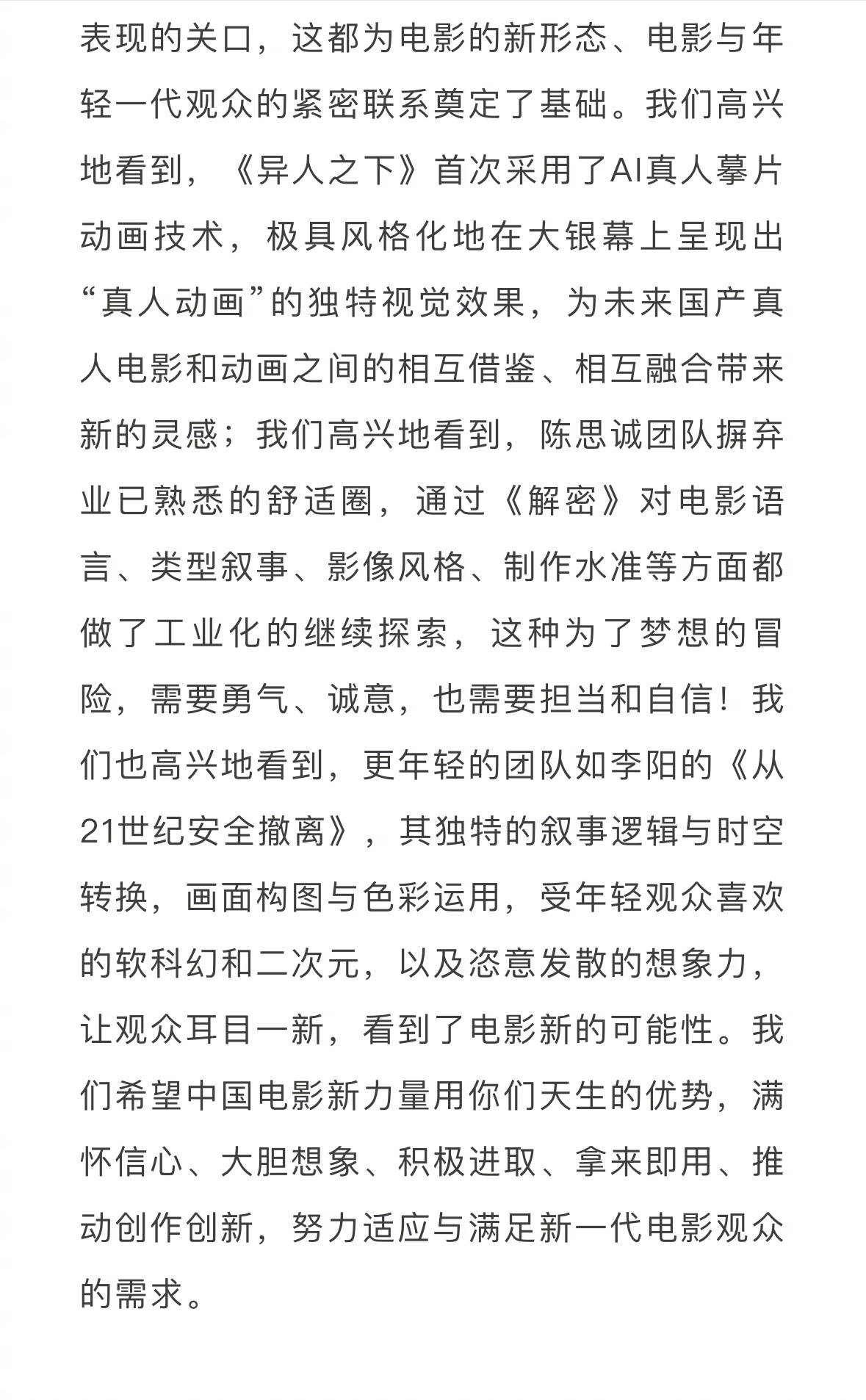 毛羽还提到,“年轻观众疏远影院的问题没有得到有效改变,电影要去和短视频、网络游戏、网络直播、竖屏剧、虚拟现实文旅体验等多种多样的娱乐形式竞争。中国电影的发展环境日趋复杂,网络舆论对电影的影响加剧,人人都是自媒体的时代,一千个观众就有一千个哈姆雷特的现象愈加明显,电影评论情绪化表达更加犀利尖锐,更需要我们拍出的电影经得起万千目光的审视,更需要我们尊重观众的心声,更需要我们冷静、理性、平等地看待观众的感受。”