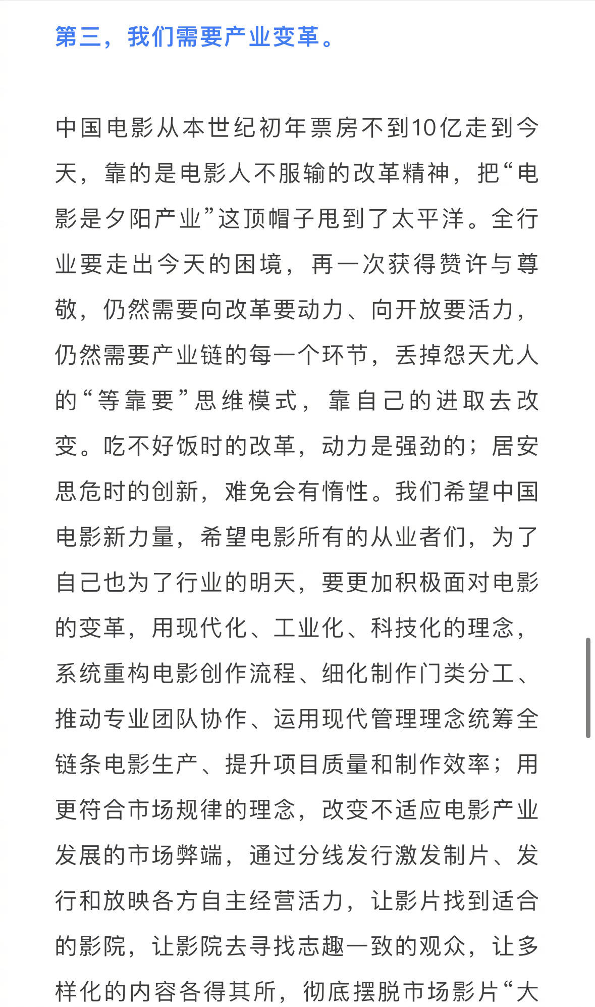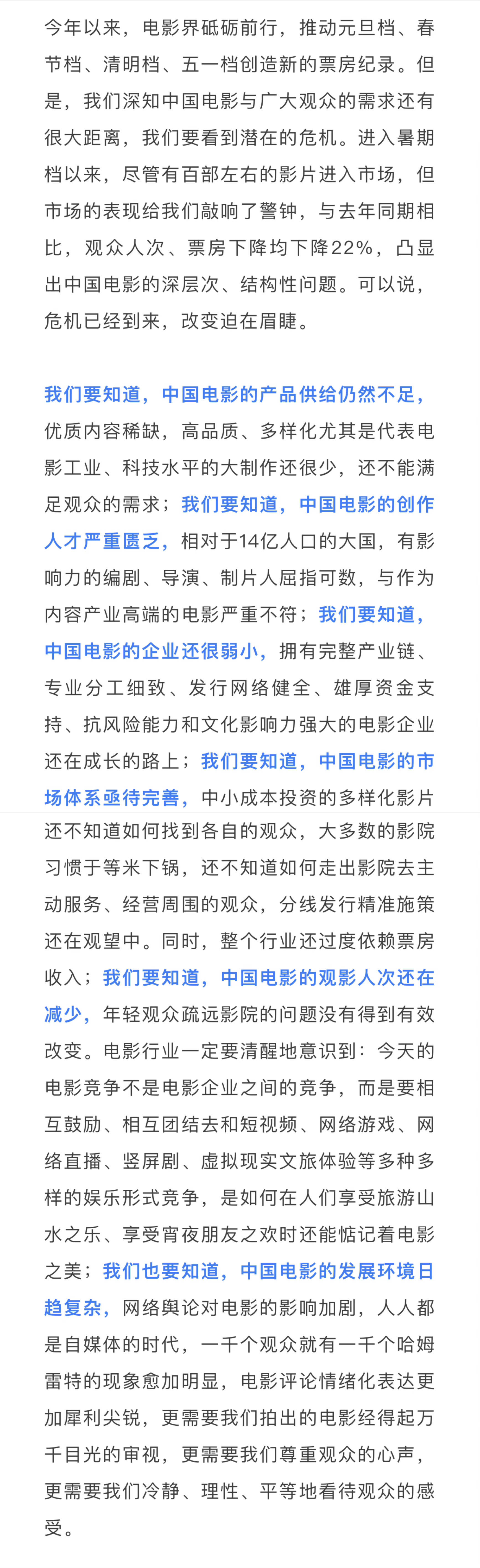 毛羽说,“暑期档的市场表现给我们敲响了警钟,与去年同期相比,观众人次、票房均下降22%,凸显出中国电影的深层次、结构性问题。可以说,危机已经到来,改变迫在眉睫。”