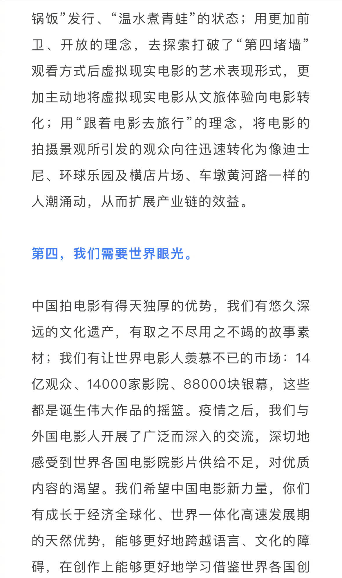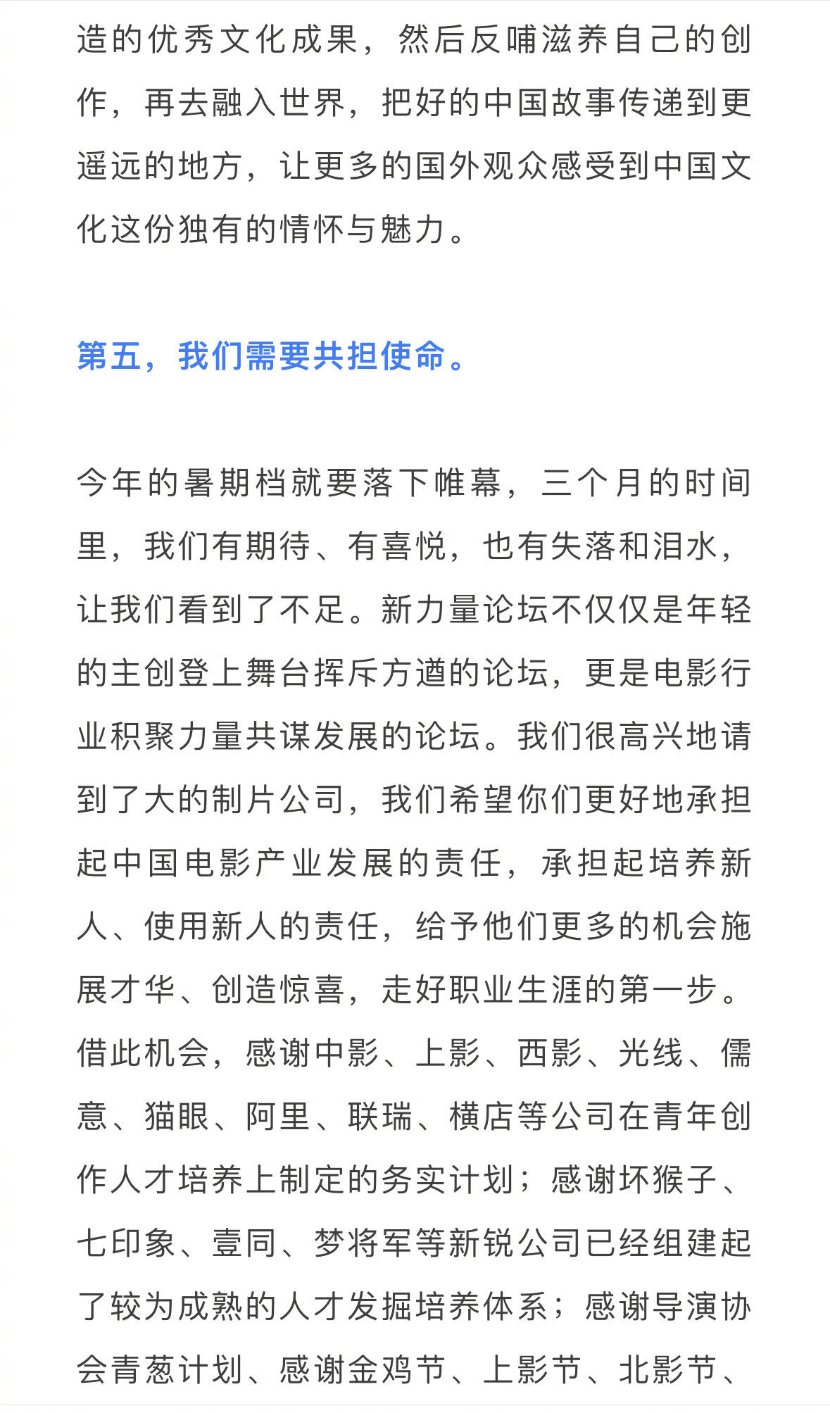 面对新老交织的问题,毛羽也对电影从业者提出了五点建议:1、我们需要好看的电影;2、我们需要创作创新;3、我们需要产业变革;4、我们需要世界眼光;5、我们需要共担使命。