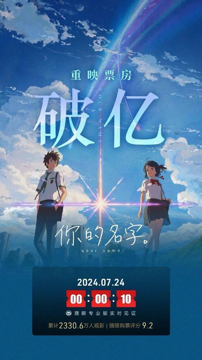 比如新海诚动画《你的名字。》不但是导演个人代表作,更是日本动画电影的经典之作,不难吸引粉丝打卡,一定程度上与2019年《千与千寻》内地重映有类似的性质,让观众愿意一次次进入影院重温,而《千与千寻》彼时在内地斩获了累计4.88亿元票房。