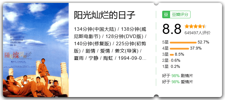 他的导演处女作《阳光灿烂的日子》更是不凡,不仅被美国《时代周刊》评为国际十大佳片第一名,还在台湾金马奖斩获最佳剧情片、最佳导演等6项大奖。