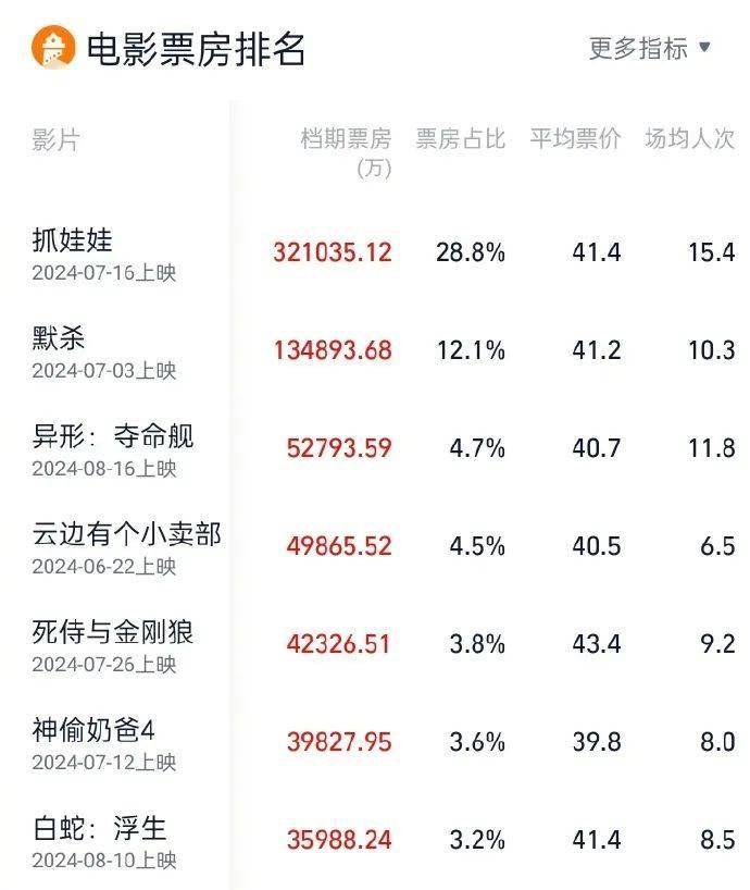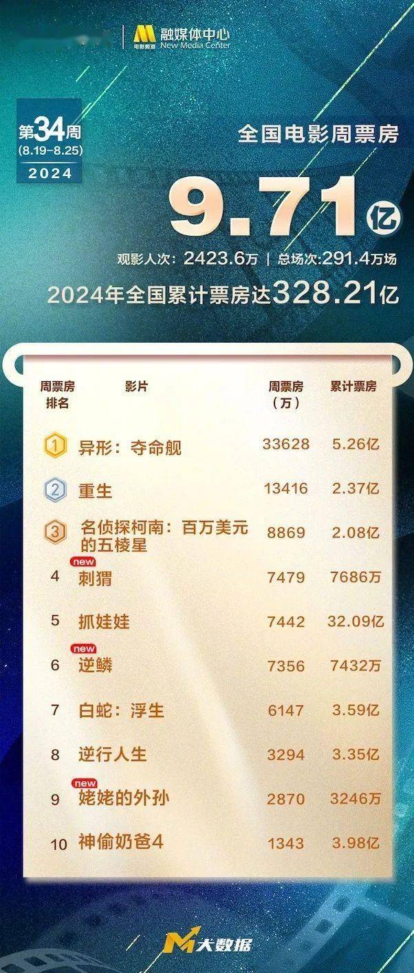 2024年第34周(8.19-8.25)全国电影周票房9.71亿元,观影人次超2423万,全年电影票房累计328.21亿元。《异形:夺命舰》以3.36亿周票房蝉联冠军,进入2024暑期档票房榜前三。《重生》以1.34亿周票房夺得亚军。《名侦探柯南:百万美元的五棱星》位列第三,周票房8869万。新片《刺猬》上映三天上榜第四,首周票房获7479万。