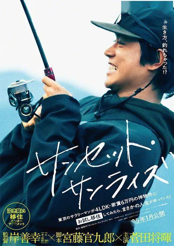 电影《日落日出》发布正式海报,菅田将晖(苏打)时隔7年再次和《啊,荒野》导演岸善幸合作,在片中饰演一位痴迷垂钓的上班族。影片根据榆周平同名小说改编,由岸善幸执导,宫藤官九郎担任编剧,菅田将晖主演,是一部围绕“移居”主题展开的喜剧,将于2025年1月在日本上映。