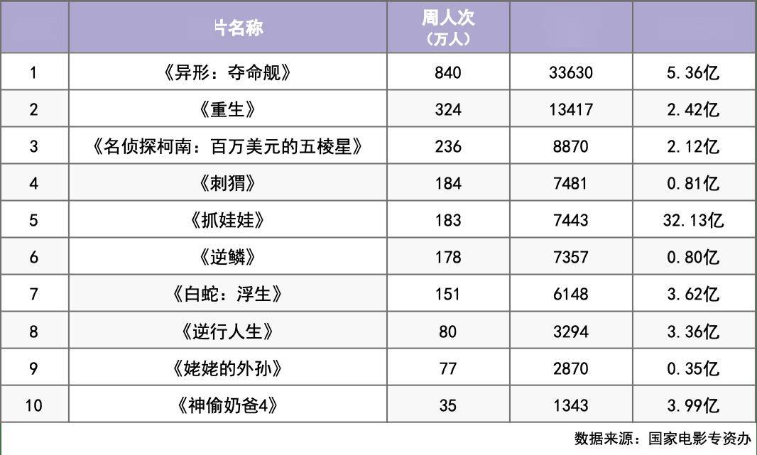 蝉联周票房榜冠军的《异形:夺命舰》在上周共收获3.36亿票房。该片仅用两天便实现票房破亿,自上映第二天起,已经连续9天登顶日票房榜冠军。目前,该片在中国内地的累计票房已突破5.36亿元,暂列今年暑期档票房榜第三名,同时,《异形:夺命舰》也凭借该票房成绩超过了另外3部目前冲进今年暑期档票房榜前10名的进口影片《死侍与金刚狼》《神偷奶爸4》《头脑特工队2》,成为今年暑期档目前最卖座的进口片。但放眼全球电影市场,《异形:夺命舰》的票房和上述3部影片相比仍有较大差距,这匹“黑马”最终能在全球电影市场上“跑”多久?还有待观望。