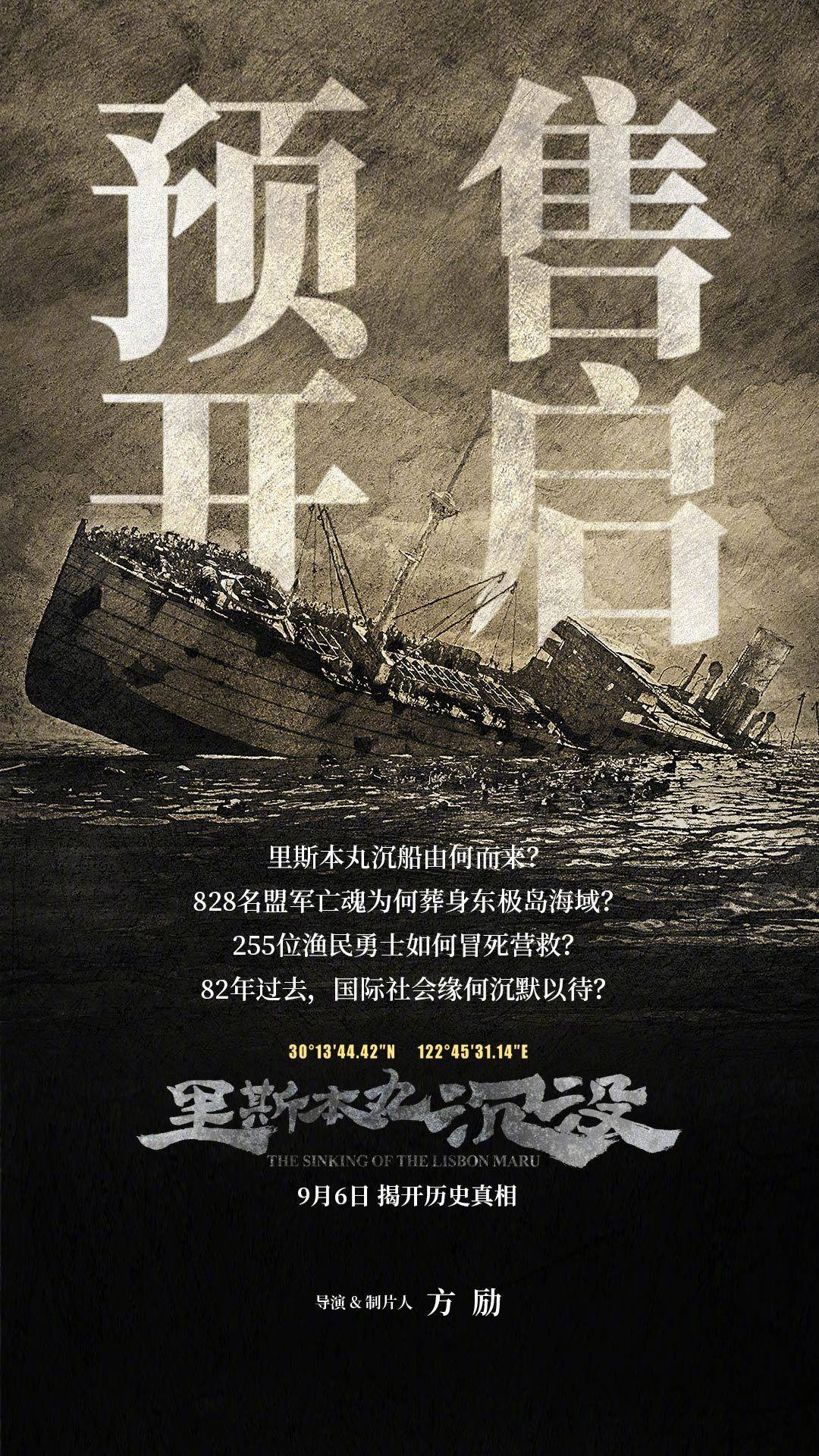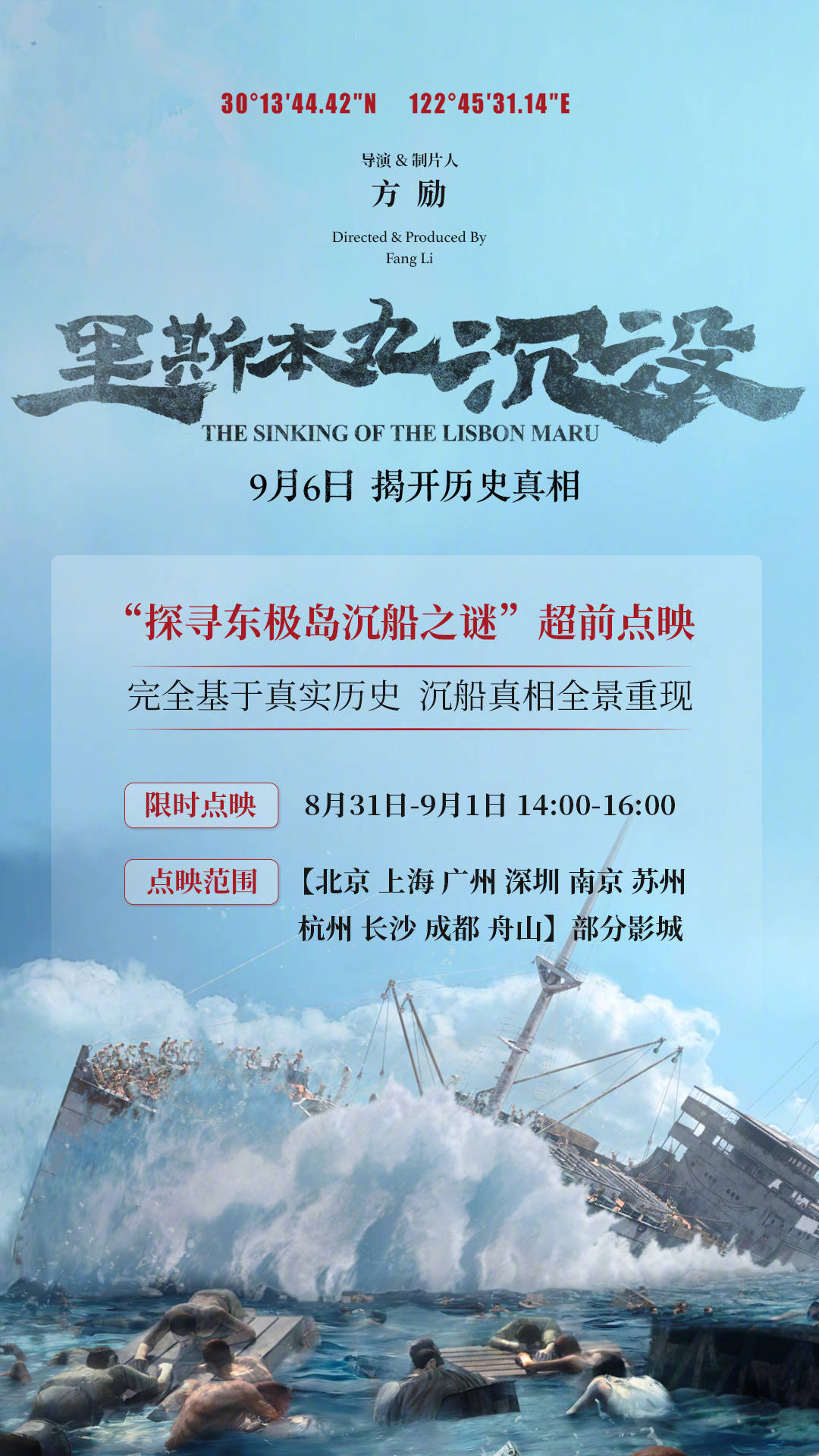搜狐娱乐讯 讲述82年前东极岛沉船事件的纪录电影《里斯本丸沉没》今日开启预售,8月31日、9月1日14:00-16:00,将在10个城市部分影城进行超前点映。
