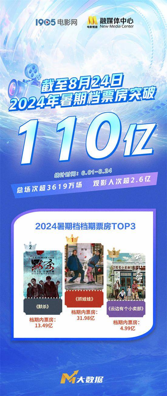 1905电影网讯截至8月24日晚,2024年暑期档全国总票房(含预售)已突破110亿元,观影人次超2.6亿,总场次超3619万场。