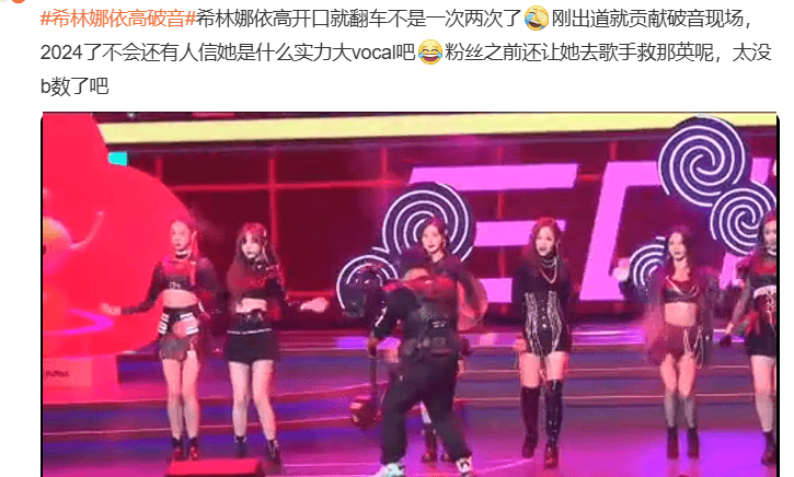 但是听得出,除了嗓子问题外,气息也不稳定,不只是嗓子问题,同时也不适合这样偏向于大众流行的歌曲,更适合偏轻机能的歌曲,几次出现高音破音、倒嗓的情况,引发众人的嘲讽。