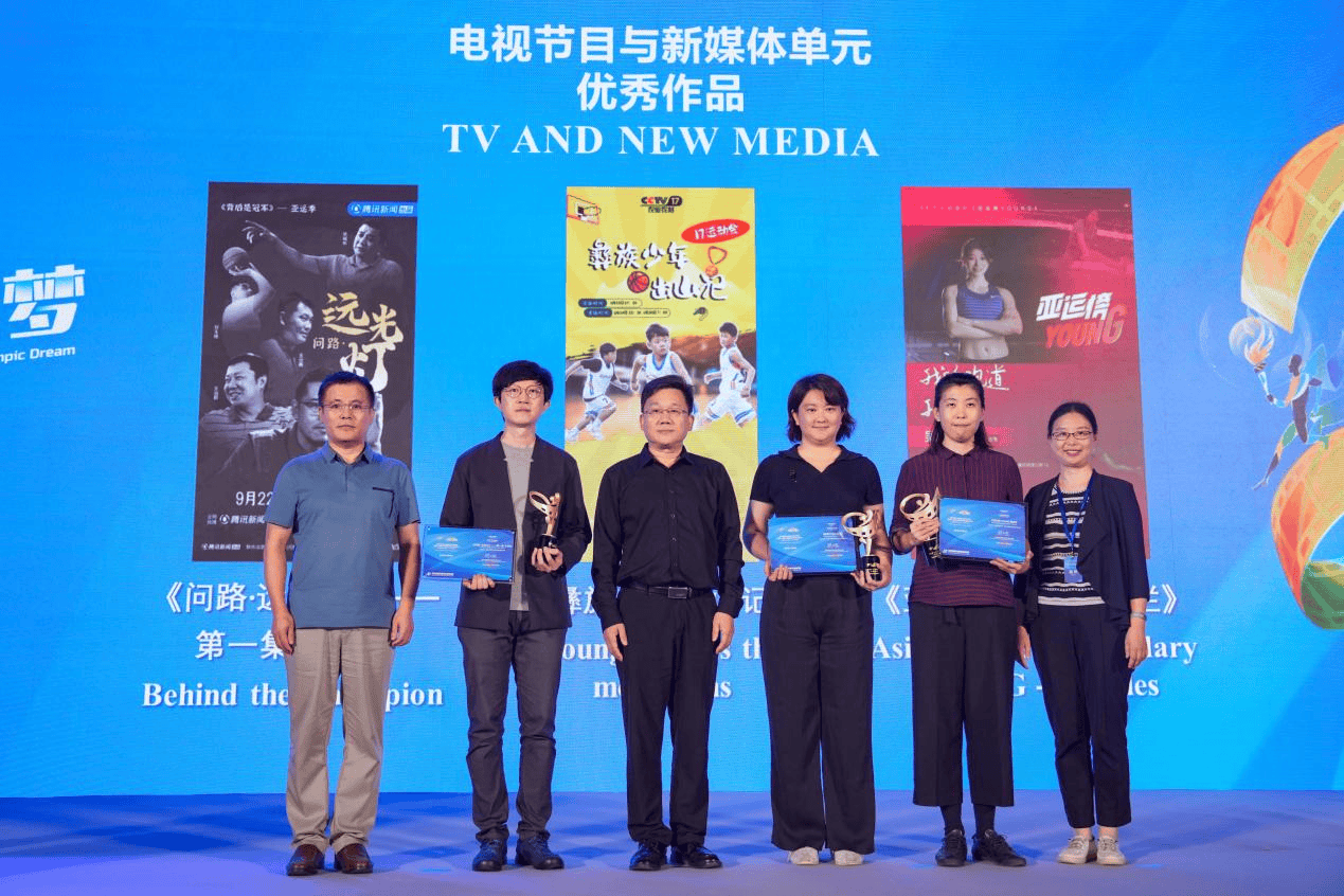 常林、孙超、贺幸辉为“电视节目与新媒体”单元入围作品《问路·远光灯》第一集 王治郅、《彝族少年出山记》、《亚运榜YOUNG-跨栏》颁发奖杯和证书。