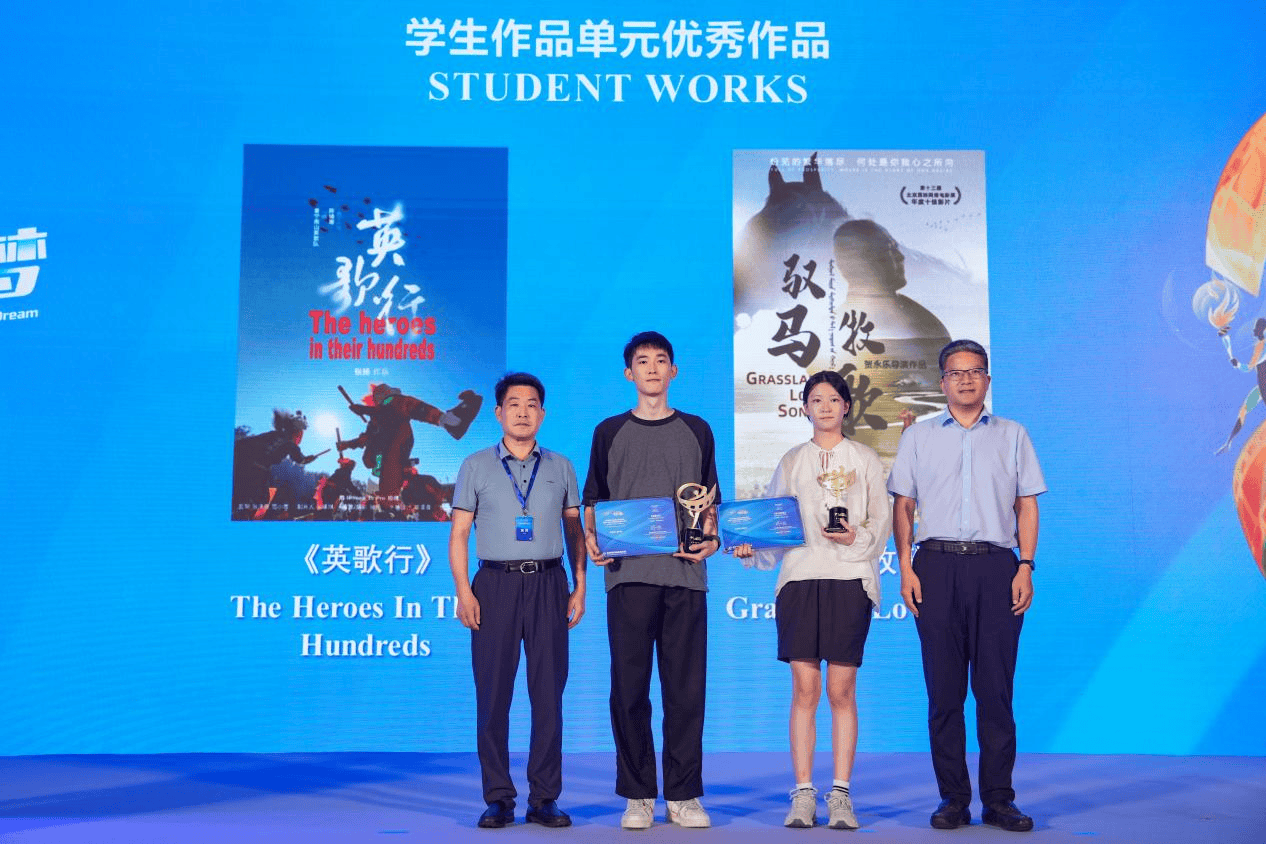 活动现场还揭晓本年度各单元的获奖作品,并颁发入围奖杯和证书。郭志国、魏登范为“学生作品”单元入围作品《英歌行》、《驭马牧歌》颁发奖杯和证书。