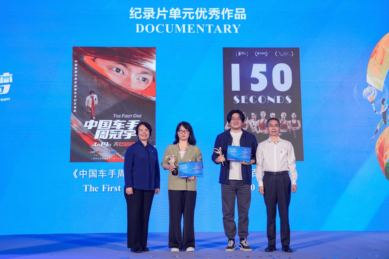 韩子荣、高超为“纪录片”单元入围作品《中国车手周冠宇》、《一百五十秒》颁发奖杯和证书。