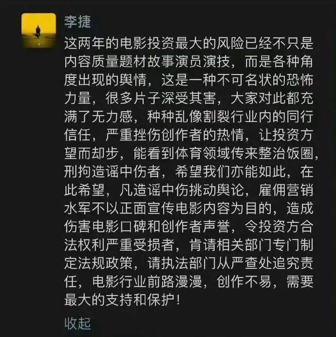 舆论能够令《隐入尘烟》《封神第一部》之流逆风翻盘,也能在映前就击败《雄狮少年》《我不是高山》等口碑潜力项目。今年暑期档,《抓娃娃》《逆行人生》《负负得正》等影片皆深受舆论牵累,而面对失控局面,片方却无力应对,只剩下阿里影业总裁李捷在朋友圈一番感慨。
