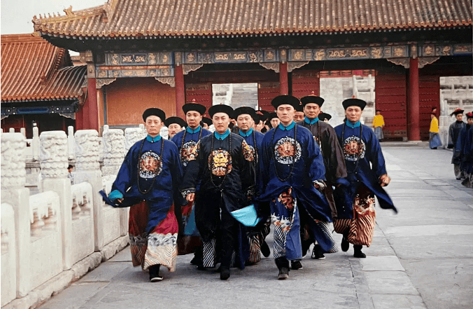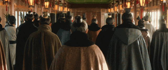 一群披着皮毛大氅的男人们,在雄伟的音乐中雄赳赳气昂昂地入场。