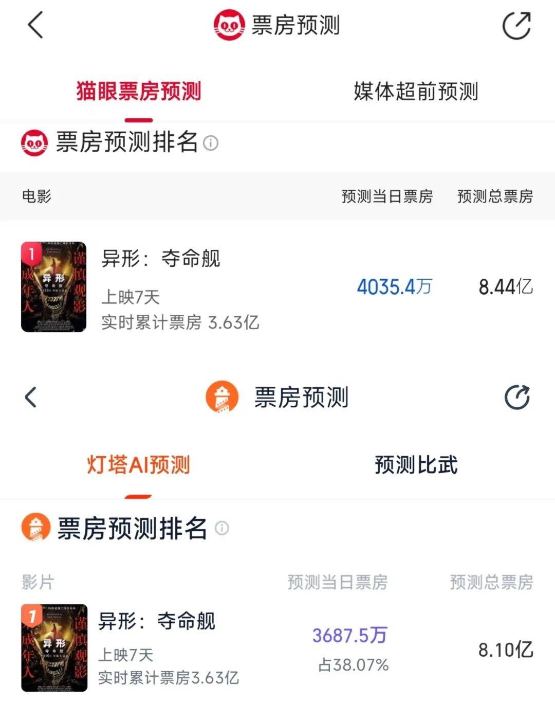 猫眼和灯塔给出的最终票房预测均超8亿,《异形:夺命舰》有望成为仅次于《哥斯拉大战金刚2:帝国崛起》的2024年度进口片票房亚军。