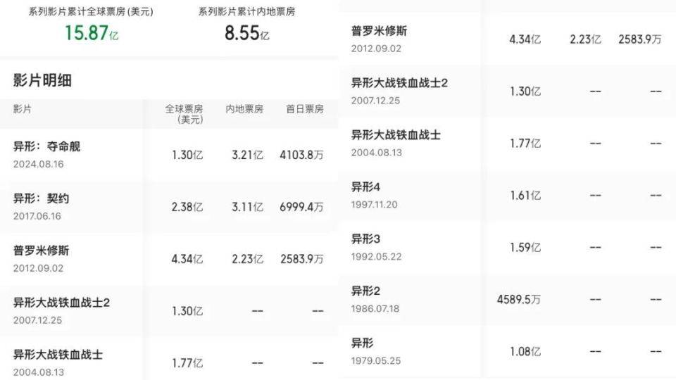《异形》剧照 票房(图源:豆瓣 猫眼专业版)