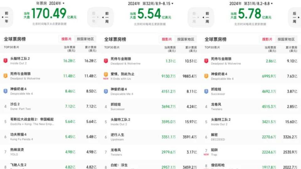 截至18日,北美月度总收益累计至6.54亿美元,即将反超去年全月录得的数字(8.13亿美元),有望成为今年第二个同比上涨的月份。而在8月第一个周三,北美年度总票房终于突破50亿美元关口,而去年在7月中旬便已撞线;鉴于下半年的新片矩阵颇为强盛,北美院线产出仍保留冲击80亿美元的机会。