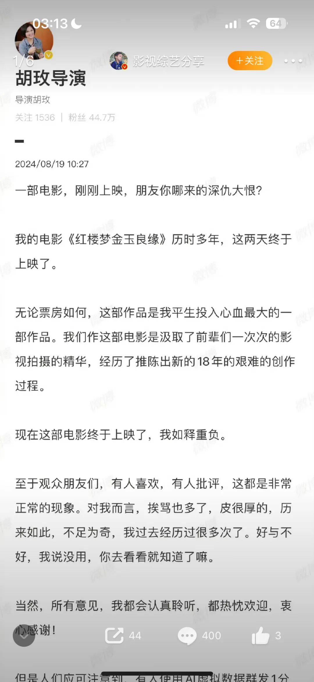 胡玫导演最近因为自己的新片《红楼梦之金玉良缘》上了热搜。