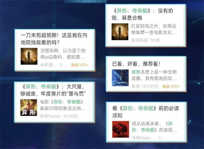 同时随着电影的放映,电影的惊悚度也一度成为观众热议的焦点,顺利实现M指数榜单“三榜齐登”——《异形:夺命舰》获得M传播指数榜单第三名。“异形最适合指缝式观影”、“异形夺命舰观后感”等话题讨论热度超900万。