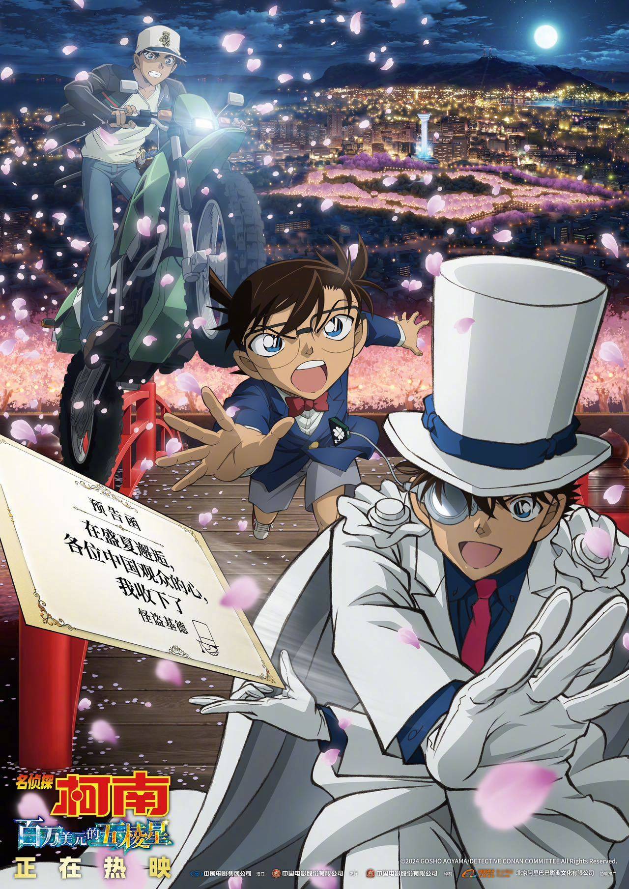 今日释出的中国独家海报中,柯南呈奔跑姿势、平次骑着摩托车,俩人都在奋力追赶着前方一脸得逞的怪盗基德,基德手中飞出的牌也成为新的亮点。一贯以珠宝为目标的怪盗基德,却将普通的日本刀视为新的偷取对象,背后肯定藏着他不可告人的秘密。还有他那张与柯南十分相似的脸,一直引发诸多猜忌,是否也到了揭晓真相的时刻……樱花落下,五棱郭美景浮现,人物身后是价值百万美元的函馆夜景,青梅竹马,心生爱意,平次藏于心底的告白是不是终于向和叶说出口了?