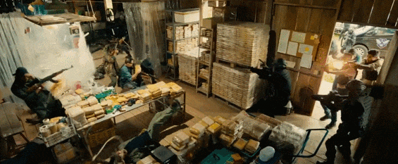 各种被砸得稀碎的桌椅家具,还有混乱的没有目标的子弹,看得人眼花缭乱,一点也不好看。