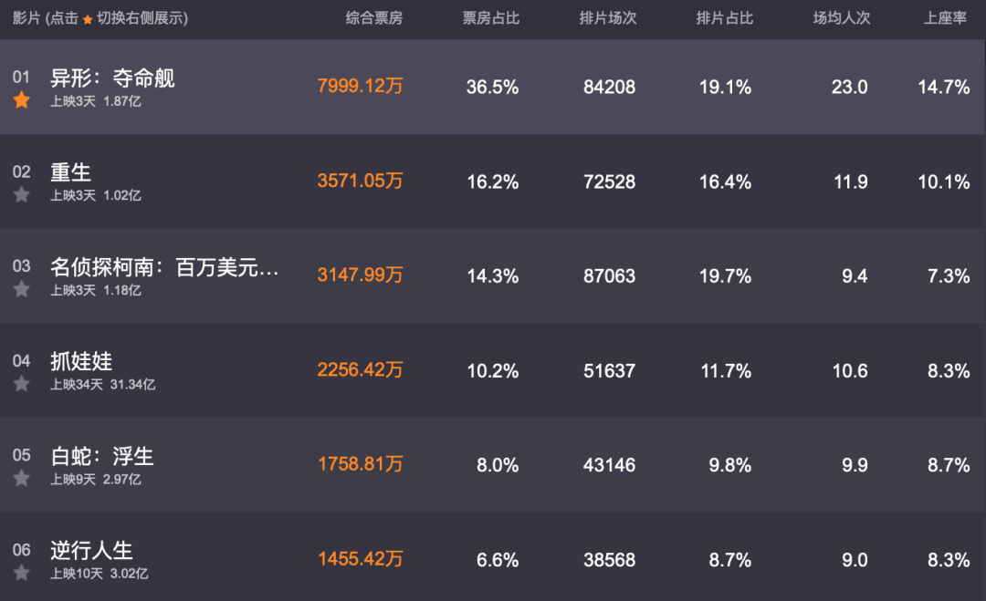 《异形:夺命舰》总票房与上座率都遥遥领先,我上周说能到3亿有同学说我太乐观,事实证明我悲观了,现在直奔7亿去,10亿也不是不可能。