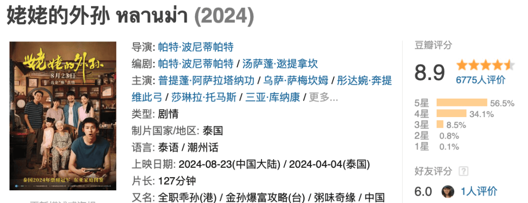4月份在泰国上映,目前是2024票房冠军,看名字和海报是不是很没卖相?豆瓣分数已经出来了,非常高:8.9