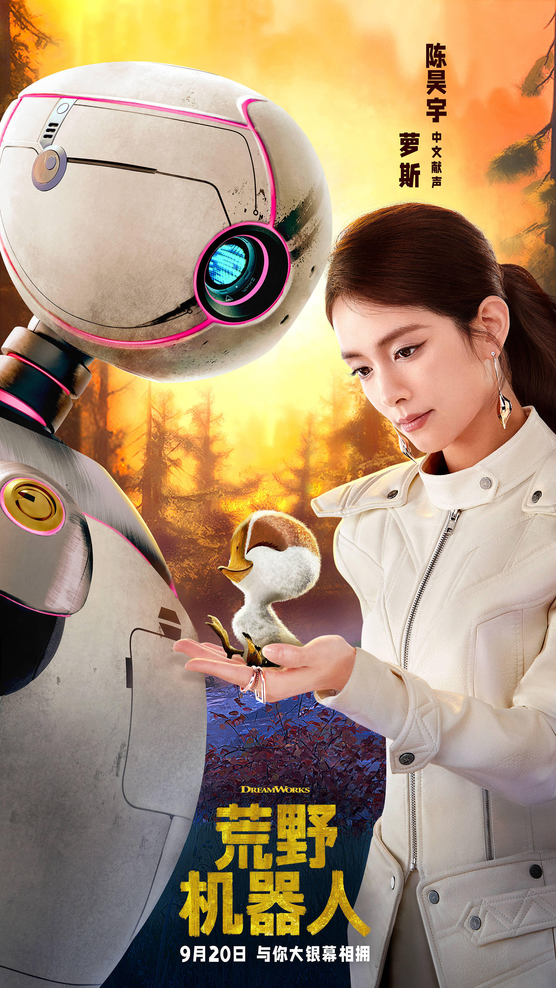 搜狐娱乐讯 梦工厂动画新片《荒野机器人》中国内地定档9月20日,提前北美一周。机器人进入荒野,与大自然和动物们为伴,还当上了一只小雁的妈妈……青年演员陈昊宇献声中文版,为主人公萝斯配音。