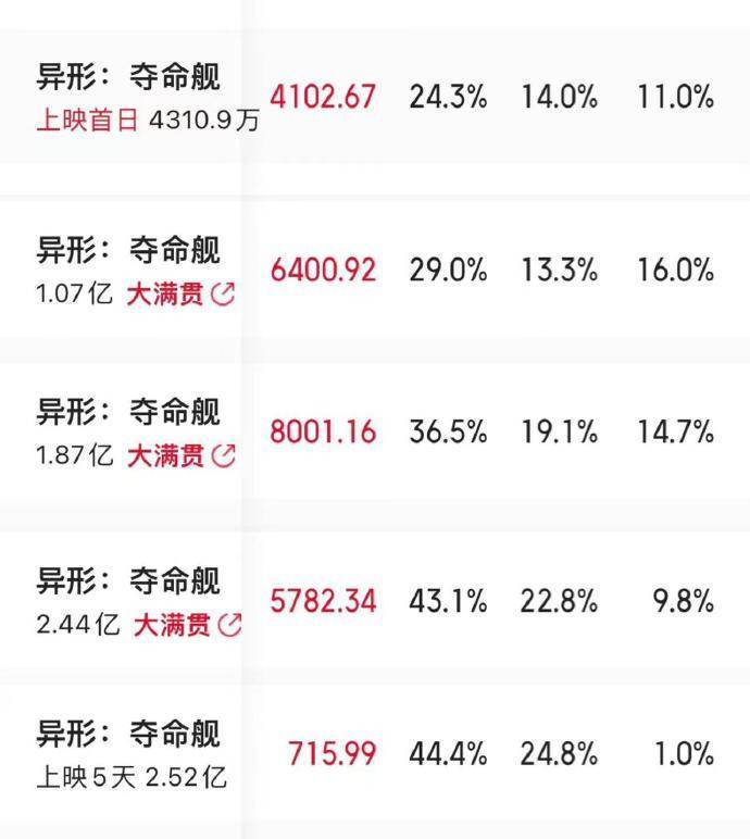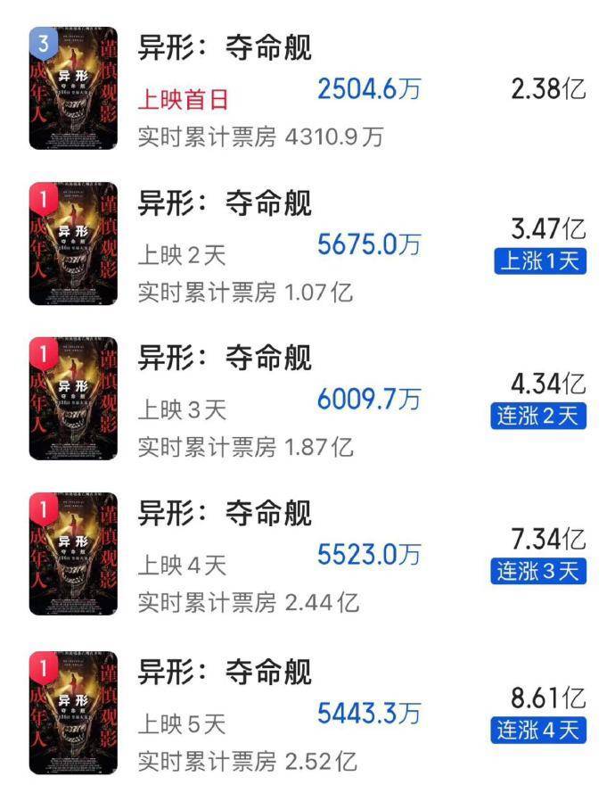 从《异形:夺命舰》过去四天的票房走势,不难看出其票房上升势头很凶猛。