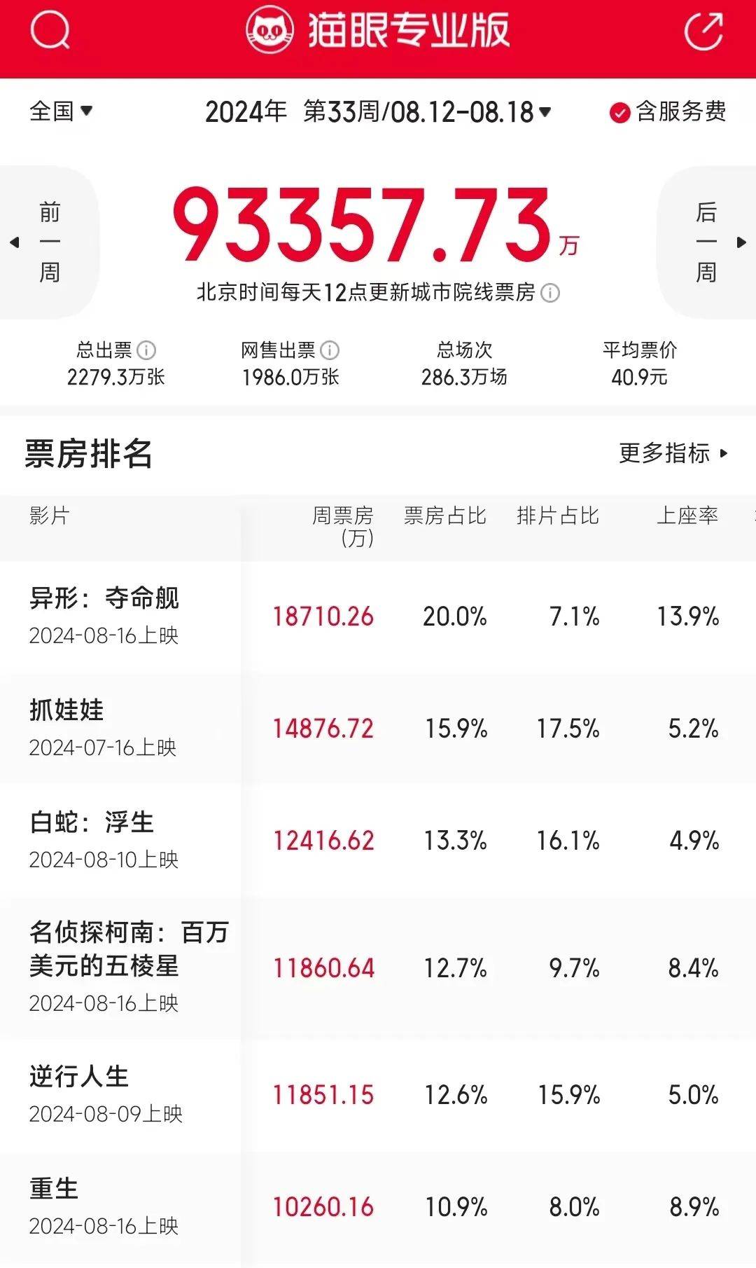 暑期档已到收尾阶段,影市表现却仍旧寡淡。据猫眼专业版数据,08.12-08.18内地一周票房仅报收9.33亿,相较前一周的9.83亿下跌5.0%,已是连续第四周下跌。