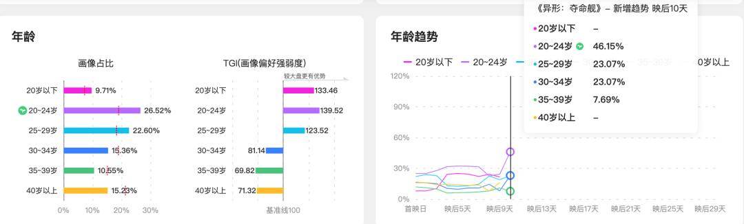 从数据显示,在首映前期,25-34岁的观众比例占据很大,这种比例也反映了这个IP对于这群观众的深远影响。但从折线图能看到,00后观众(20-24岁)的比例在映后近乎直线式的增长。