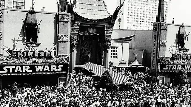 1977年《星球大战》上映时好莱坞著名影院 Grauman's Chinese Theatre 爆满的情景