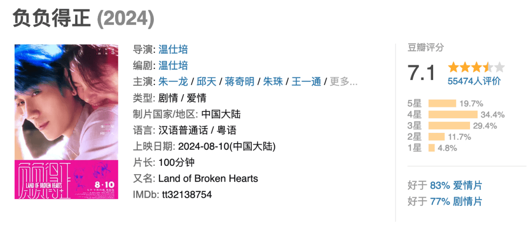 朱一龙和邱天主演的爱情片,上周刚上映院线,评价还可以,所以也上榜了。