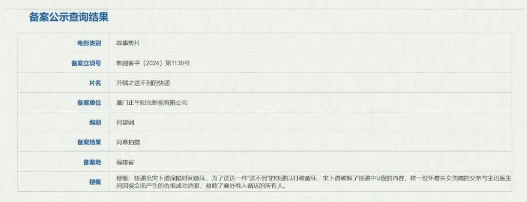 如今,这一爆款IP即将开发电影版《开端之送不到的快递》,备案单位为厦门正午阳光影视有限公司,编剧依然是剧版编剧何碧娴。