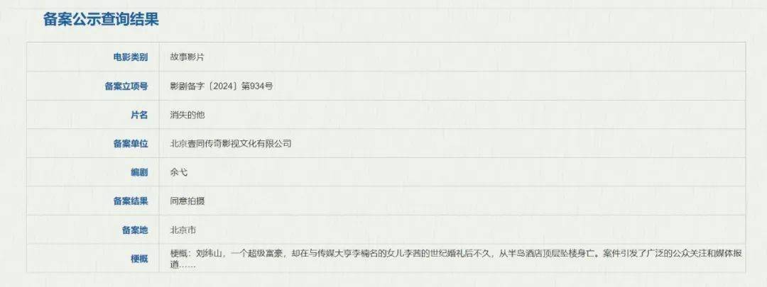在《消失的她》豪取35.23亿票房后,陈思诚公司壹同传奇影视文化公司备案新片《消失的他》,编剧余弋曾参与《我和我的家乡》、网剧《唐人街探案》等作品。