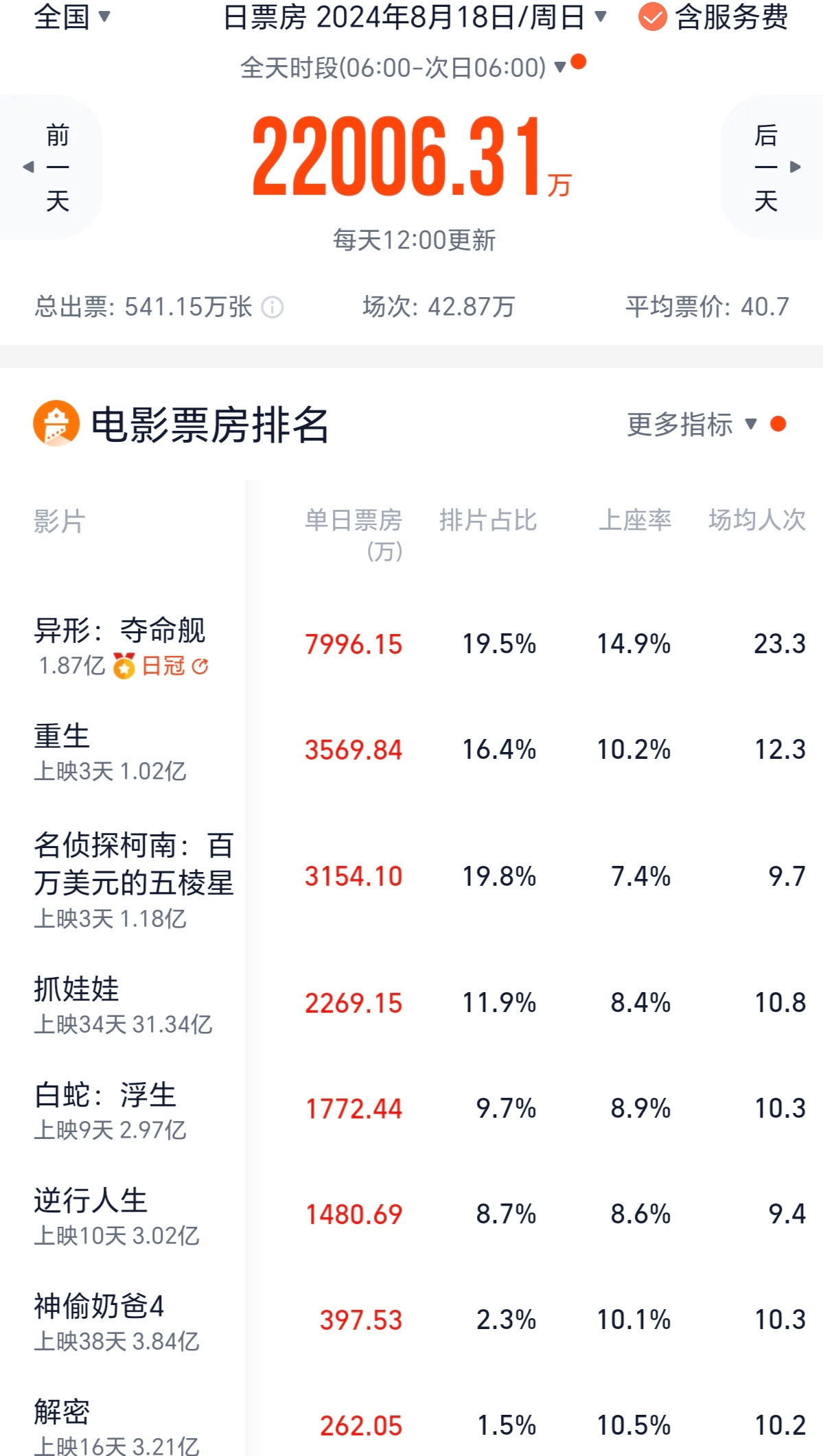 《名侦探柯南:百万美元的五棱星》高开低走,上映首日是票房冠军,第二天、第三天连跌,先后被《异形:夺命舰》和《重生》超过,跌到了第三。