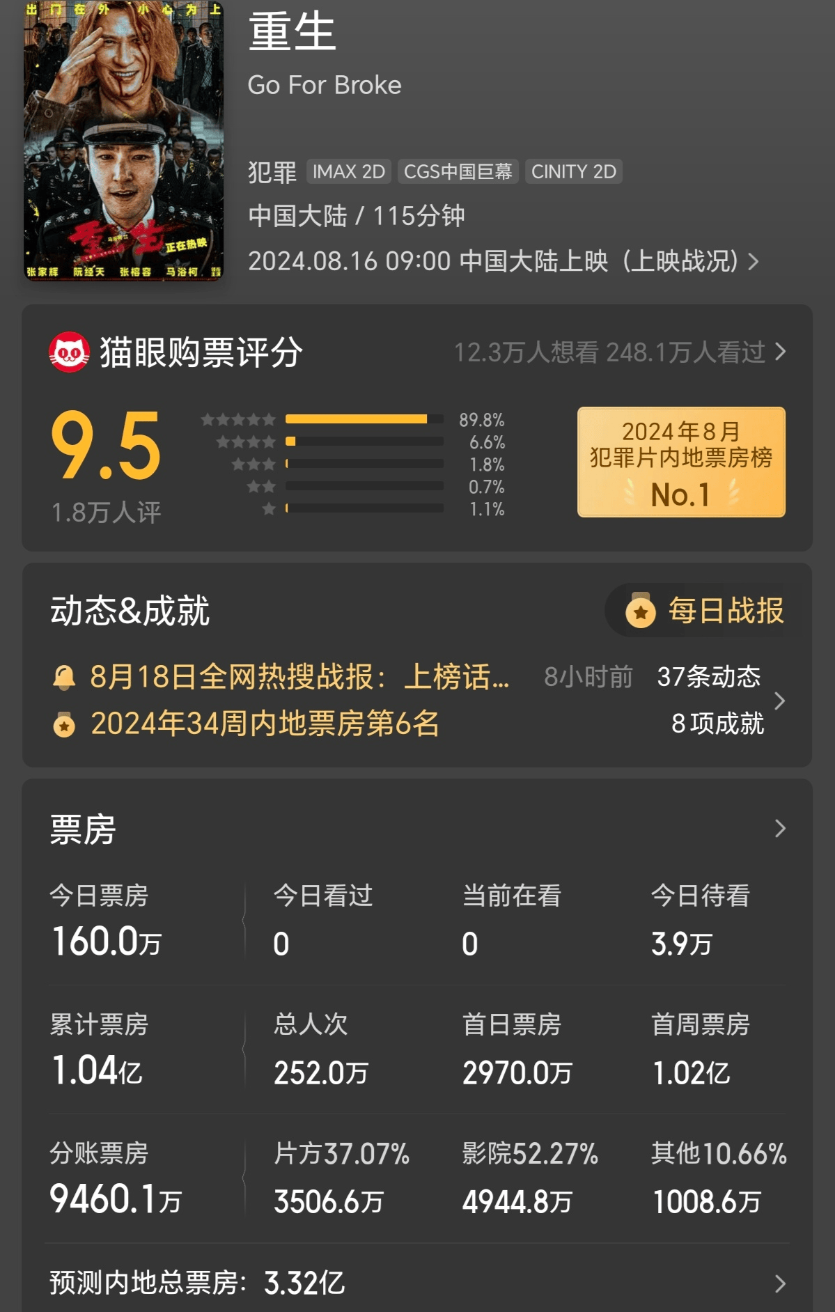 马浴柯执导,张家辉、阮经天等主演的环东南亚犯罪动作片《重生》表现也不错,首日票房3000万元,次日3700万元,第三日3600万元,超过《名侦探柯南:百万美元的五棱星》成为第二名。三天累计票房破亿,最终票房可能过3亿元,会超过马浴柯的上部作品《怒潮》。