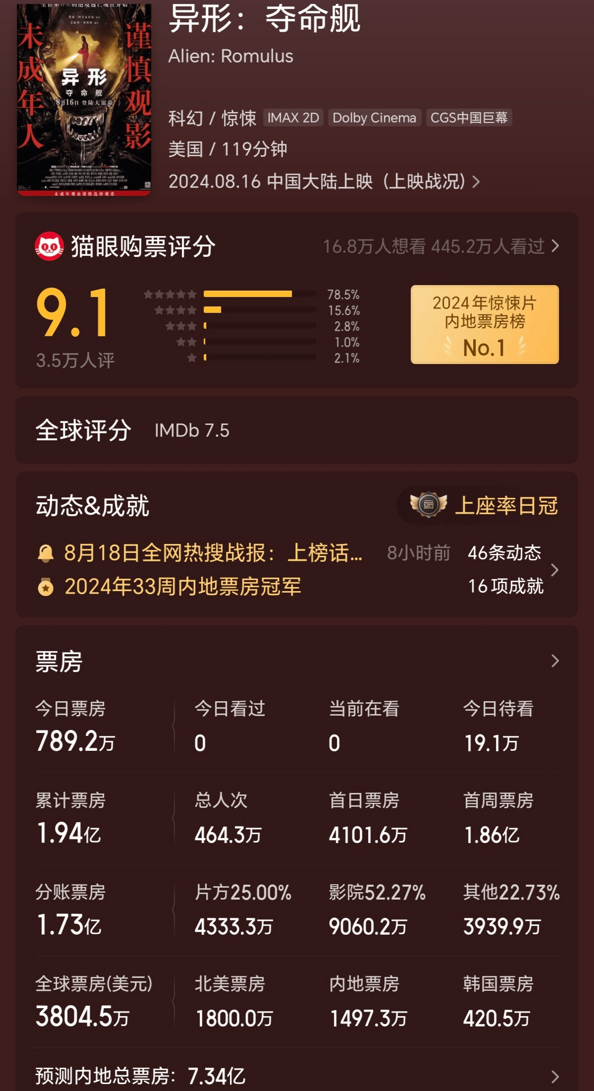 该片首周末三天累计票房1.87亿元,在今年的好莱坞电影中,高过《死侍与金刚狼》,仅次于《哥斯拉大战金刚2》,与《异形:契约》首周末的1.99亿元接近。依此走势,猫眼专业版预测该片最终总票房可能过7亿元。
