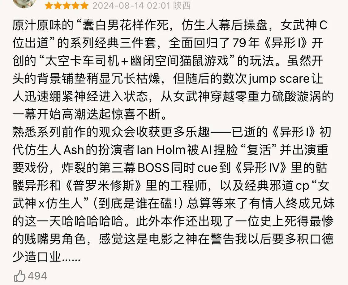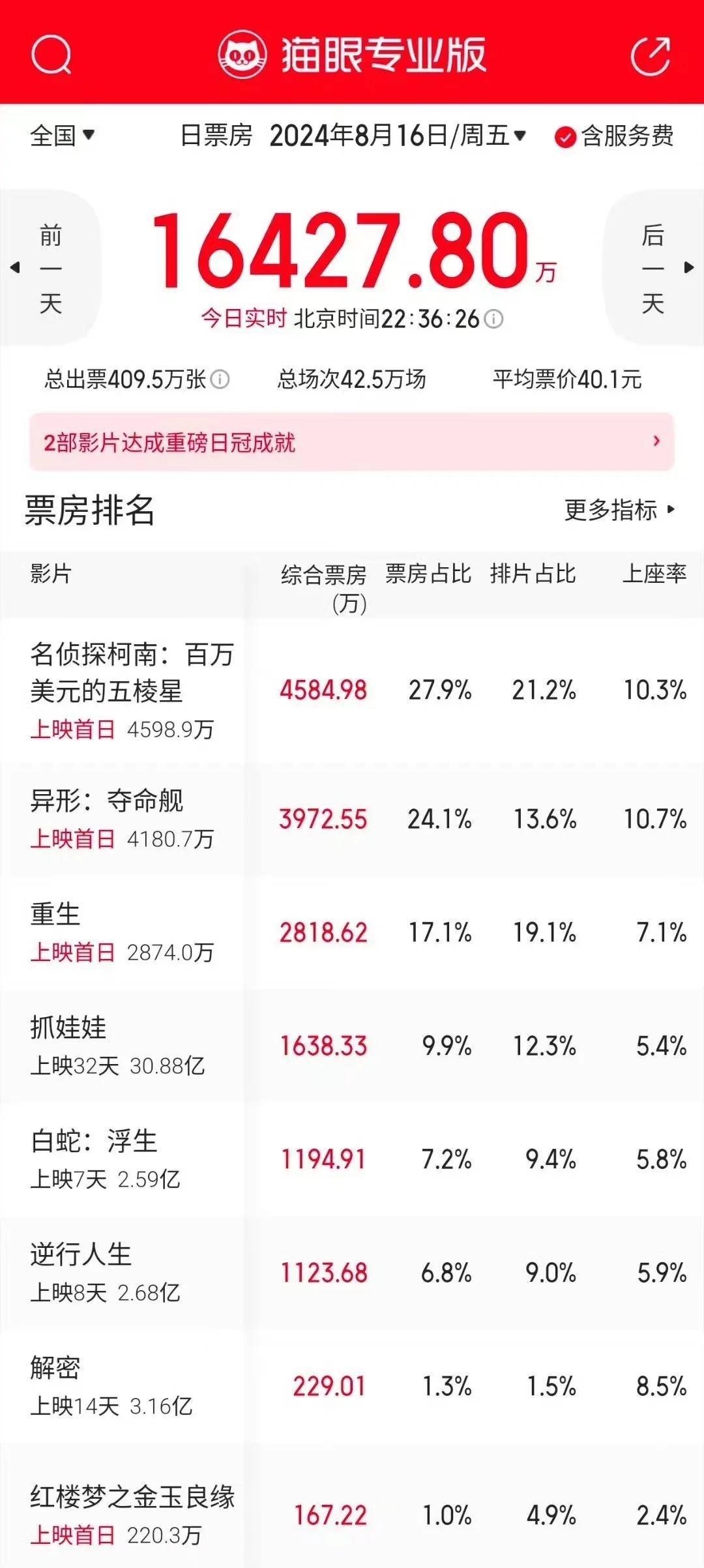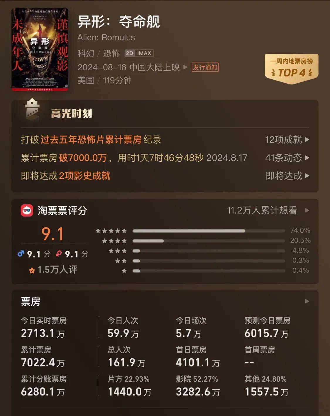 据悉,电影《异形:夺命舰》在8月16日公映首日表现强悍,在新片中成为上座率第一,甚至超过了《名侦探柯南》这样的新片,而且票房已经比单日预测数目高出1500万。