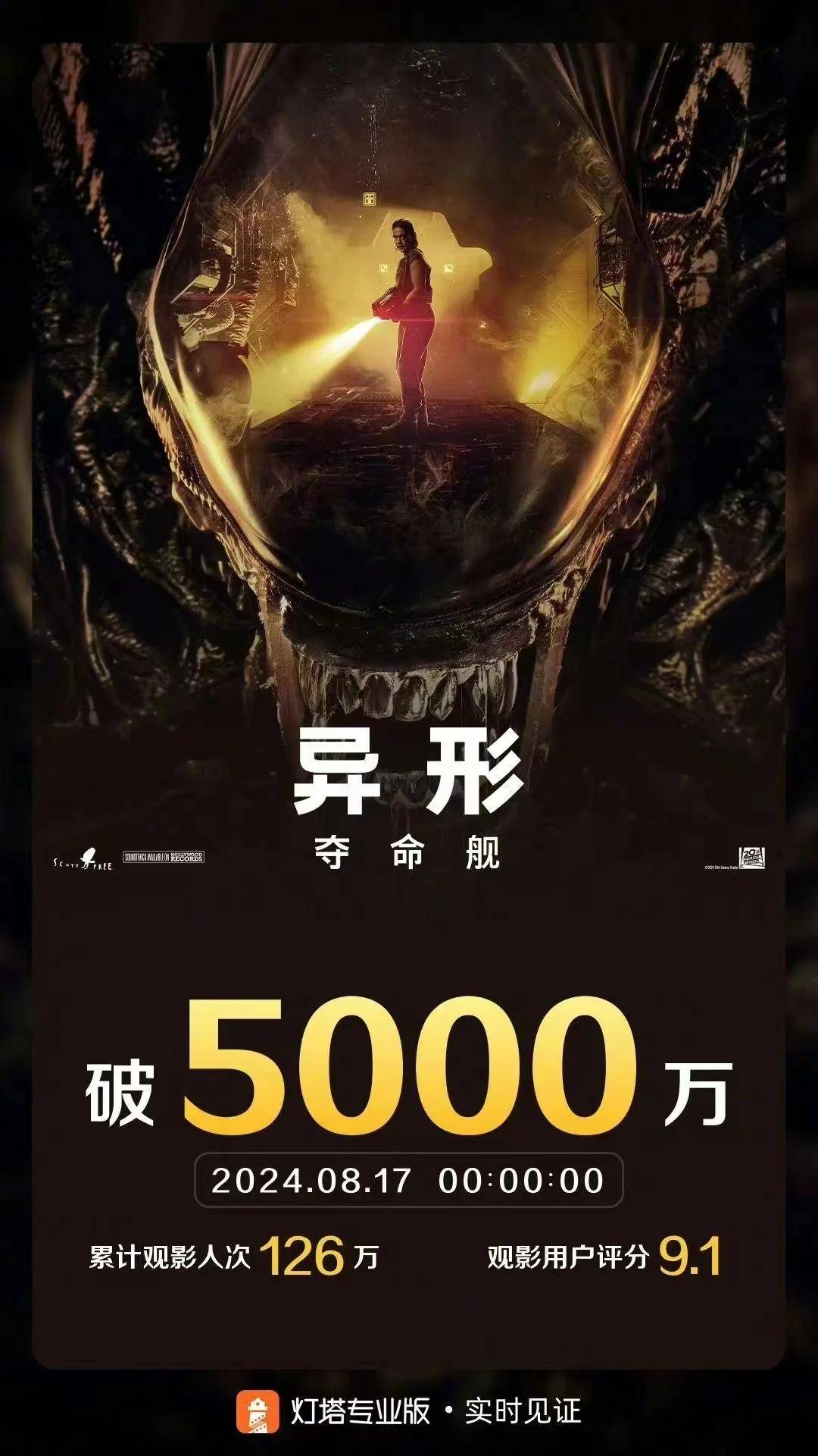 据灯塔专业版实时数据显示,截止8月17日0时0分,影片《异形:夺命舰》票房5000万。