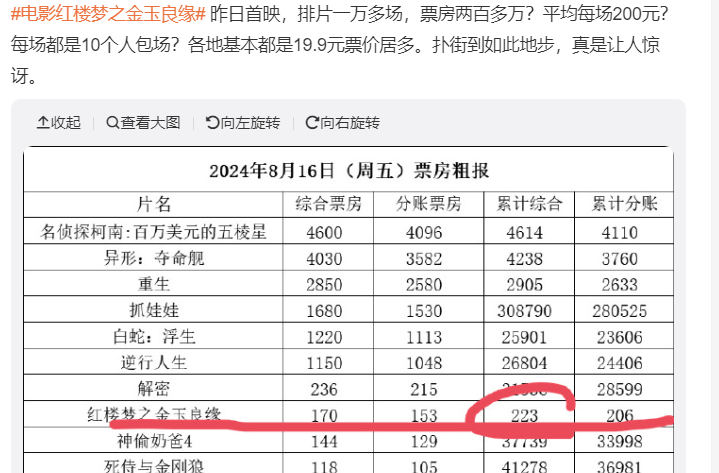 还让人挺意外的是,这部电影的投资方有于冬的博纳影业,之前就为这部电影站台宣传。而于冬制作发行了不少大片热片,在业界很有影响力,《红楼梦之金玉良缘》这样惨淡的票房,让想看热闹的观众没地方花钱,于冬居然都没干预,到底是爱莫能助不想与市场看衰对抗,还是对这部作品早就看衰,惨败在意料之中,自然就无动于衷,不想给自己添麻烦。