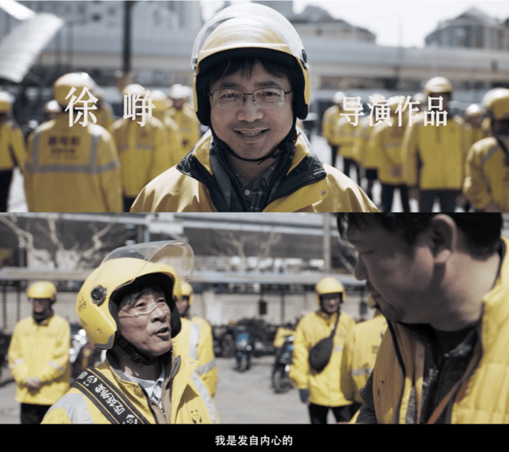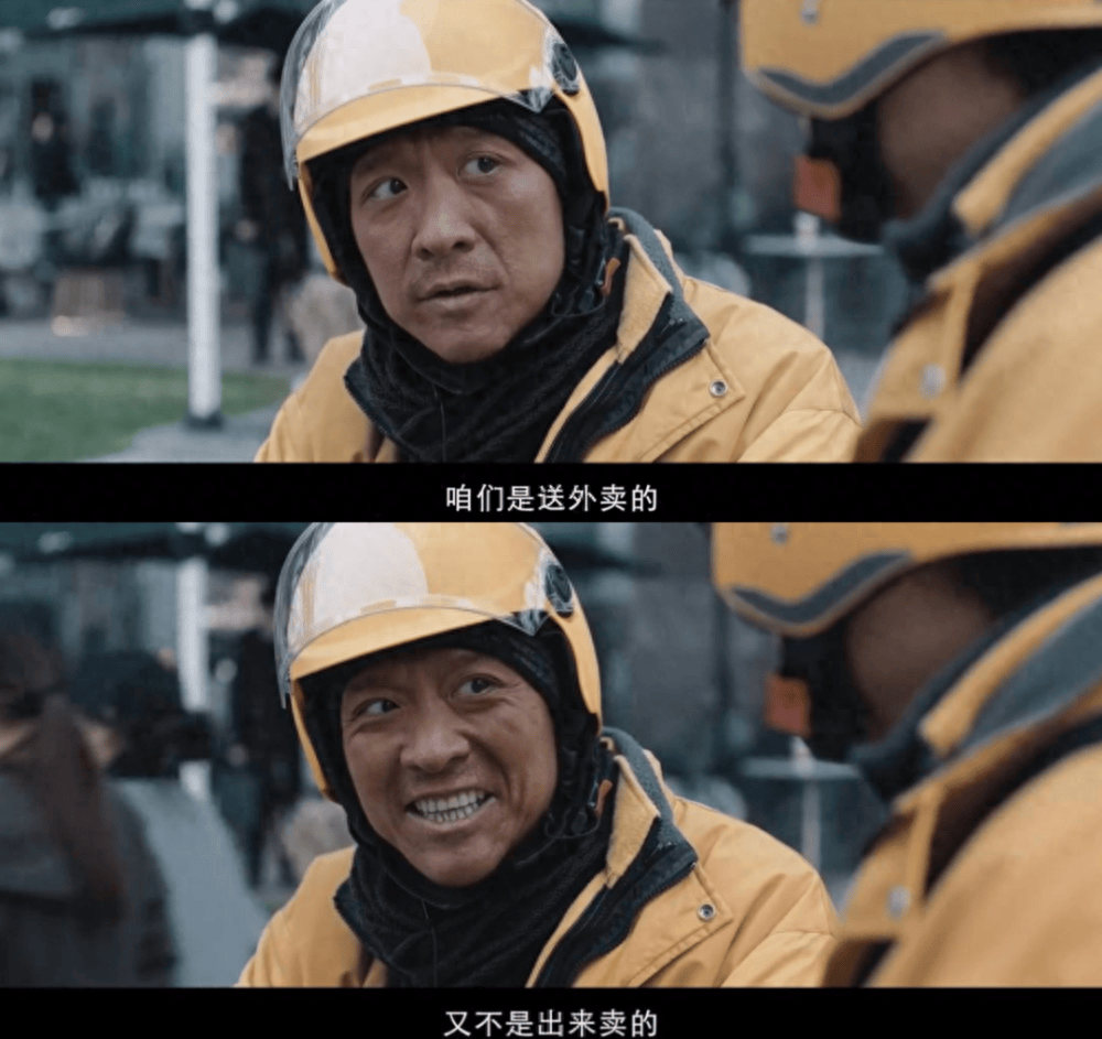 而在《逆行人生》的海报中,一众主演们在镜头前穿着外卖服,开心的笑着,但实际上背景中没有笑容的那些外卖员,才是真正的外卖员。