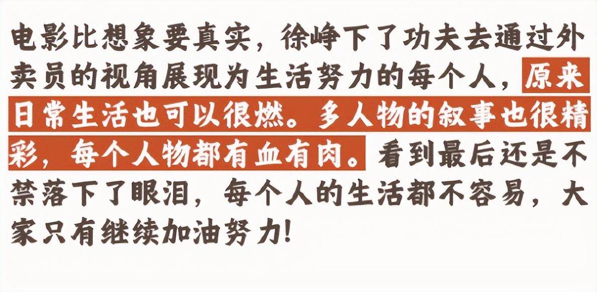 虽然是以“外卖员”为故事主角,但影片所讲的远不止于外卖员怎么了,而每一个普通的我们正在经历什么,想在讲“这个时代怎么了?”“我们又怎么了?”
