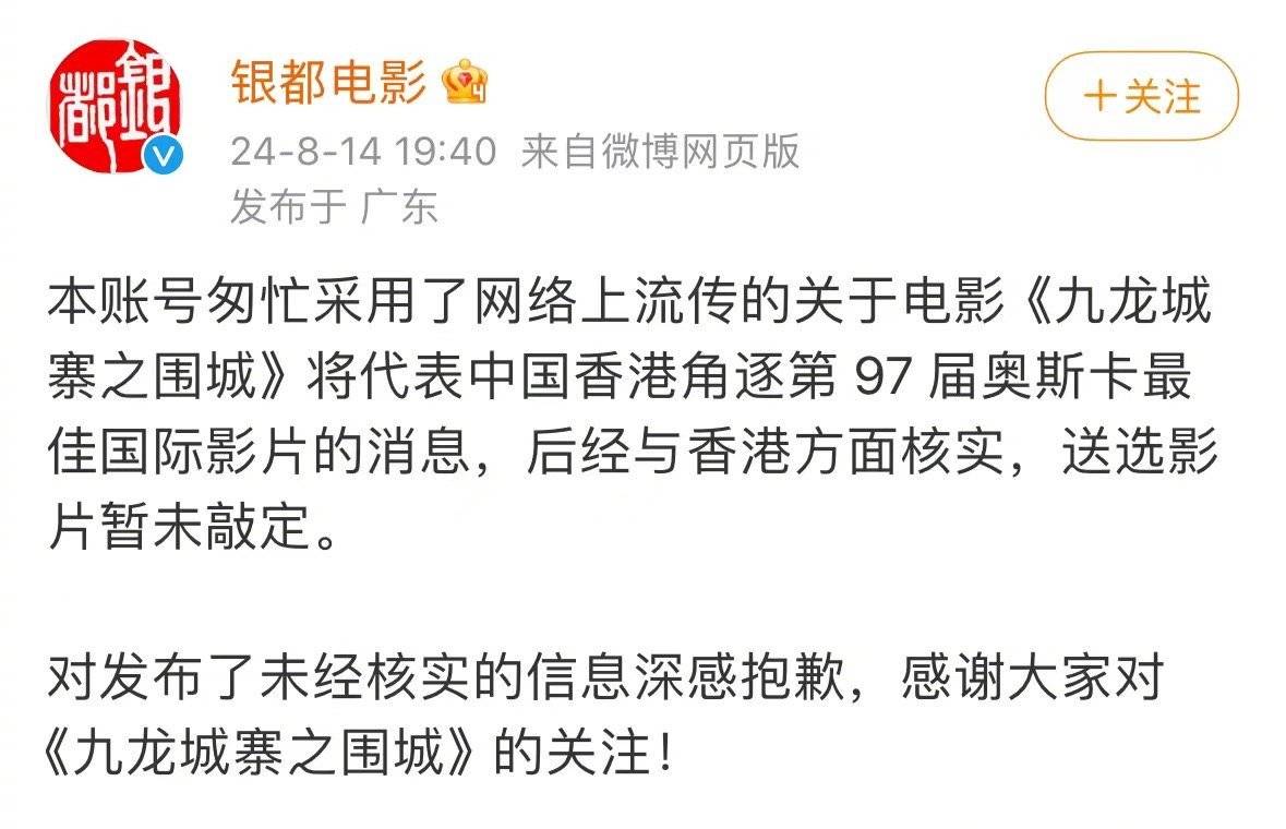 搜狐娱乐讯 8月14日,银都电影发文否认《九龙城寨之围城》将代表中国香港角逐第 97 届奥斯卡最佳国际影片。银都电影表示公司已和香港相关方核实,今年奥斯卡最佳国际影片的送选影片暂未确认。