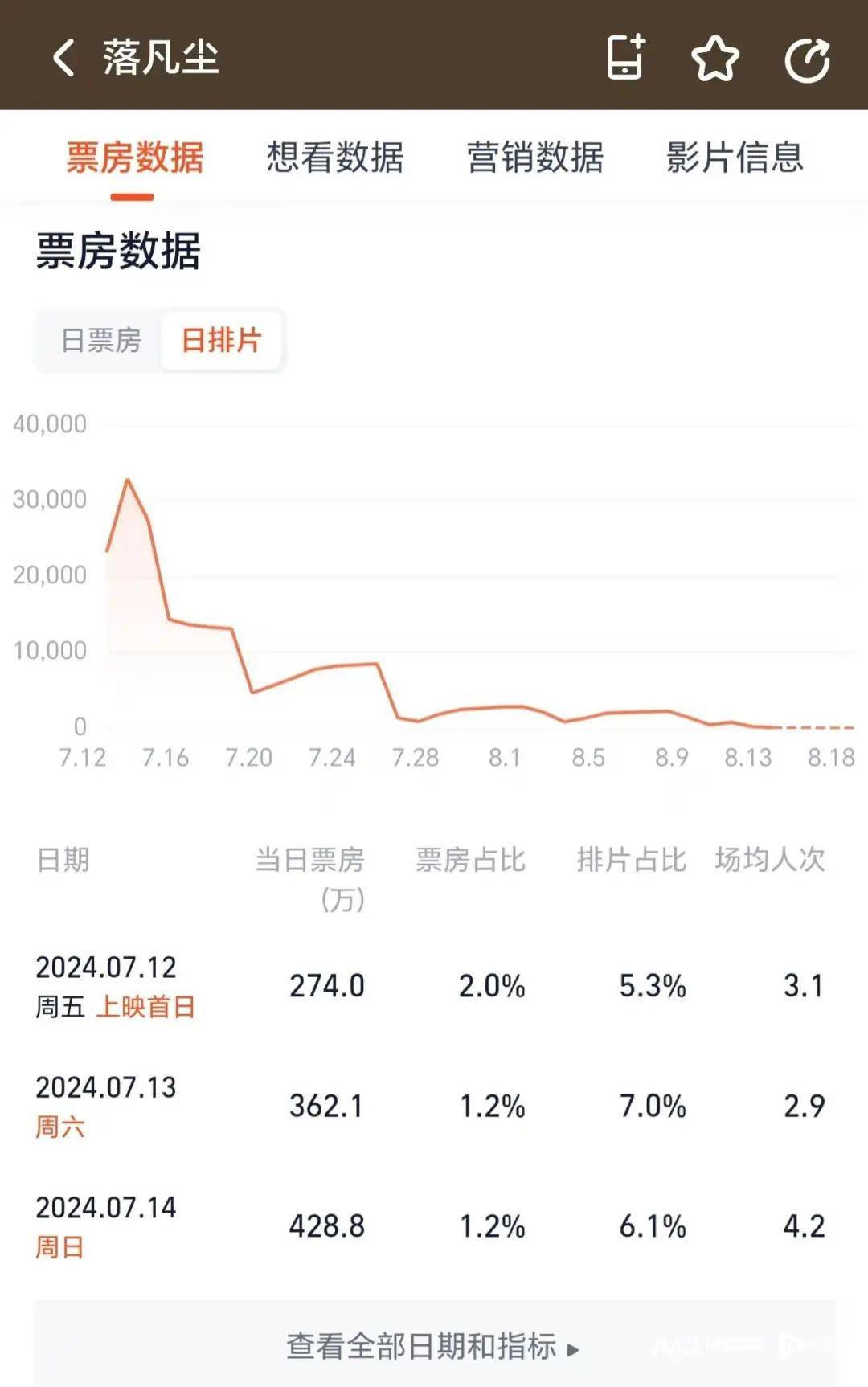 从6月25日到7月11日,《落凡尘》经历了将近半个月的点映,这一阶段影片口碑初步发酵。高口碑小体量的电影如果将点映运用得到,会对排片起到助推左右,例如王宝强的《八角笼中》。而《落凡尘》在将近半个月的点映期过后,7月12日,影片正式上映当天的排片率仍然只有5.3%。