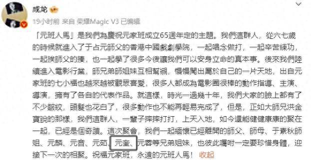 8月12日晚,成龙在晒出元家班的聚会合影,画面中除开他与洪金宝、元彪、元秋等同门重聚。70岁的成龙感慨他们师兄弟如今也已有白发皱纹,同时也怀念已经去世的师父和同门,其中元奎的名字让外界错愕。