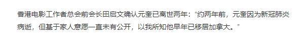 对此,演员田启文也透过媒体证实了成龙的说法,称元奎近年来和家人定居加拿大,两年前因病离世,其家人低调处理后事并未对外公开。