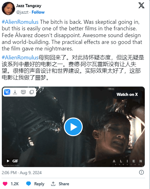 截至目前,本作的情节披露很少,且还没解禁媒体评价。但至少根据零散的社媒反馈汇总,影片质量不错。乌拉圭导演阿尔瓦雷兹是近年来好莱坞炙手可热的恐怖片匠人,他着意模仿1979年首部《异形》的幽闭恐怖风格,还原效果也得到了系列开创者雷德利·斯科特的肯定——要知道,过往老雷对非自己执导的《异形》续集,可是一贯持批评态度。